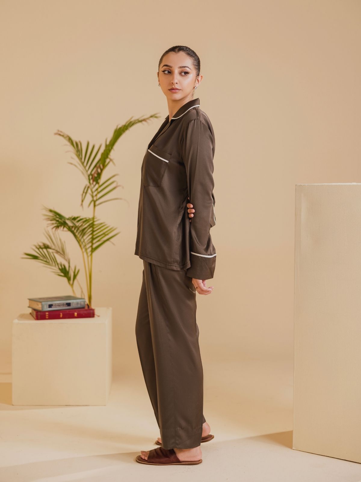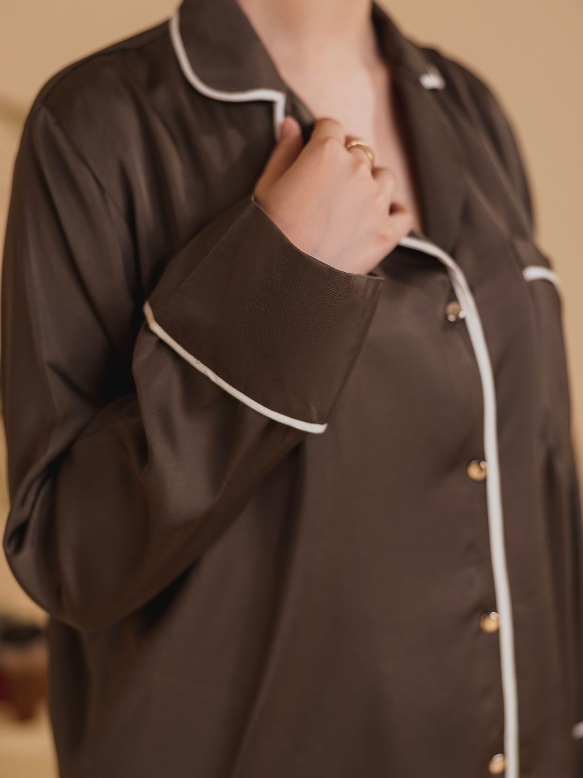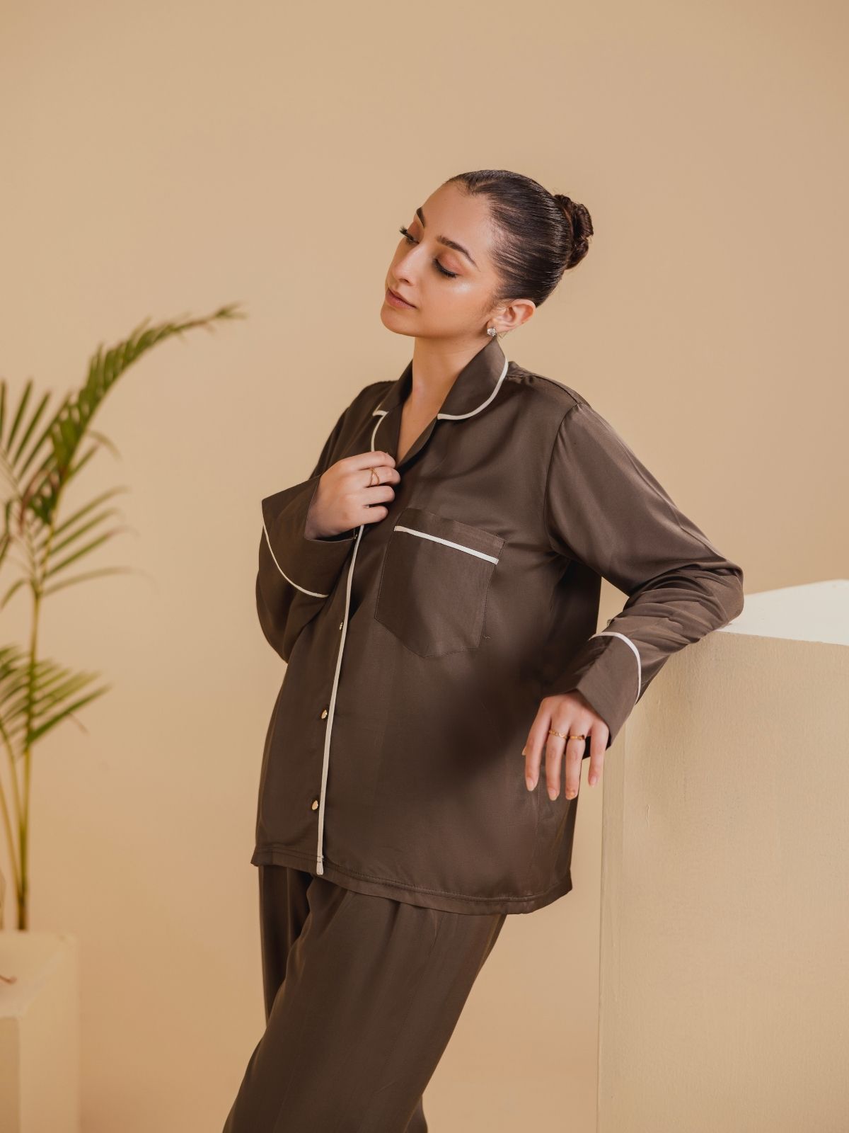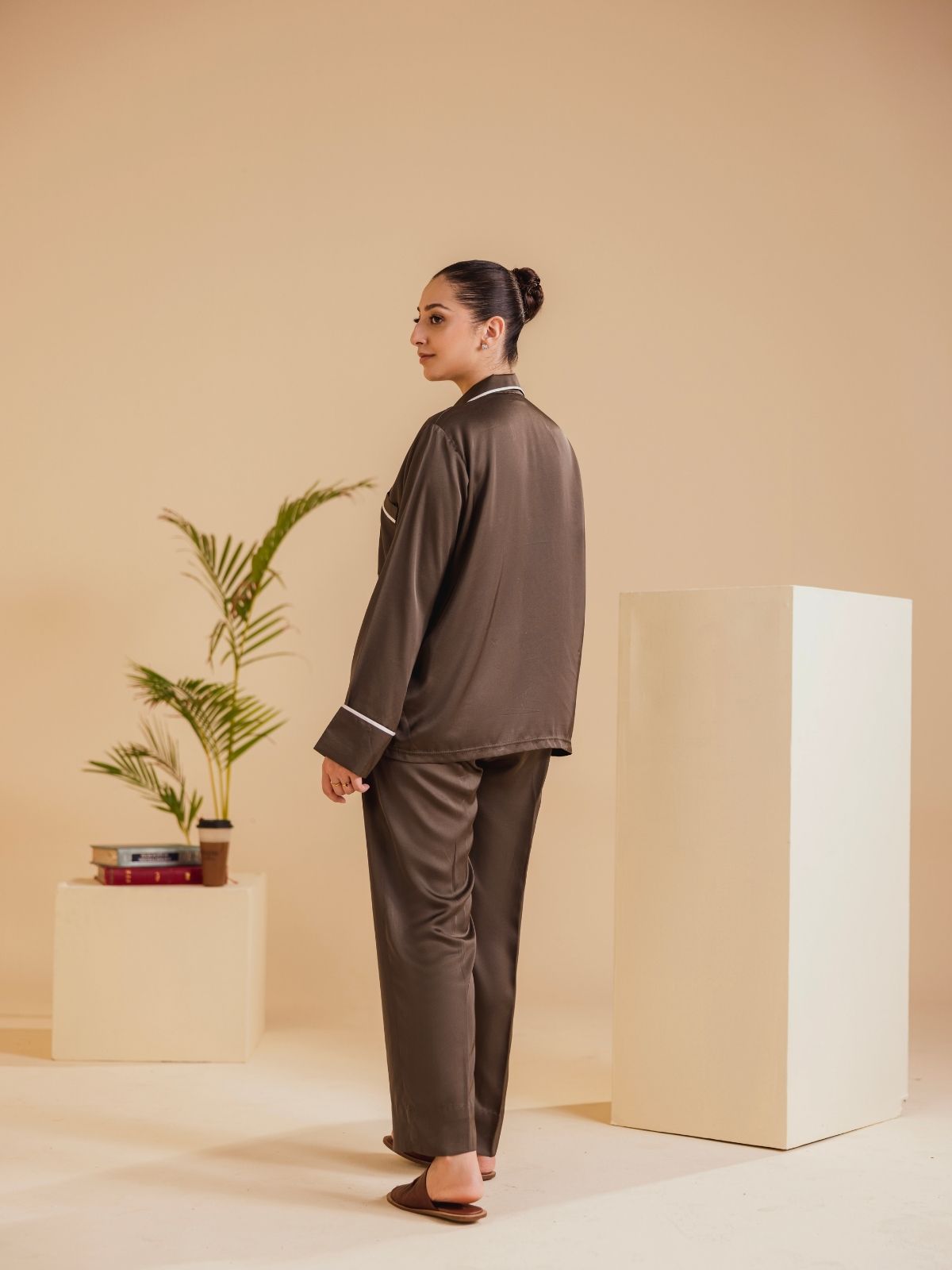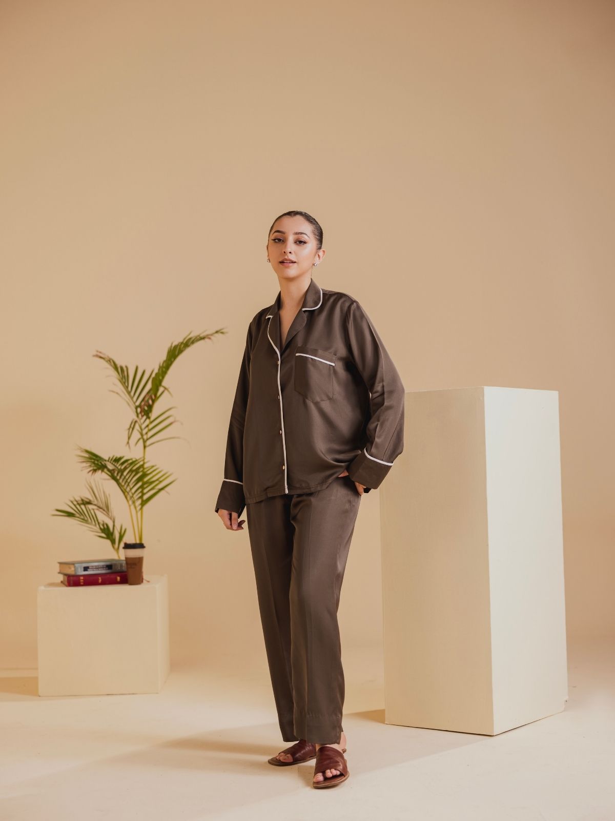 The button-down top features a relaxed fit, structured collar, and chest pocket for a polished finish, while the wide-leg trousers drape fluidly for all-day comfort. Perfect for lounging at home, traveling in style, or dressing up for an understated day look, this set proves that comfort and elegance can go hand in hand.